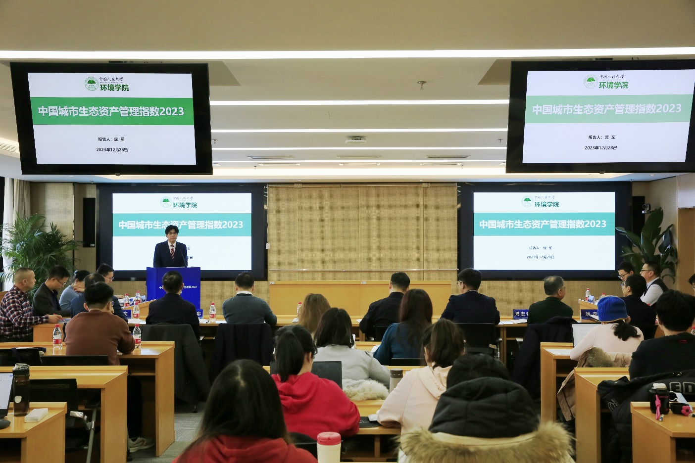 On December 28th, the School of Environment and Natural Resources of Renmin University of China, the Institute of Ecological Civilization of Renmin University of China, and the National Academy of Development and Strategy of Renmin University of China jointly released the “China’s Urban Ecological Asset Management Index 2023” in Beijing. Prof. LIU Qing, Vice Dean of the National Academy of Development and Strategy of Renmin University of China, presided over the press conference. Prof. ZHU Xinkai, member of the Standing Committee of the Party Committee and Vice President of Renmin University of China, attended the conference and delivered a speech. Prof. PANG Jun, Dean of the School of Environment and Natural Resources of Renmin University of China, released the “China’s Urban Ecological Asset Management Index 2023” on behalf of the research group. JIA Tieying, Secretary of the Party Committee of the School of Environment and Natural Resources, attended the conference. Experts and scholars from Development Research Center of the State Council, Chinese Academy of Environmental Planning, China Academy of Fiscal Sciences, Renmin University of China and Beijing Normal University attended the press conference and discussed the results of the index.