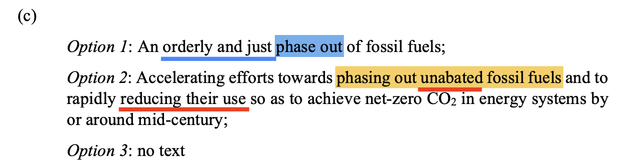 The second agenda item—the First Global Stocktake—was the most critical issue of this COP, and the outcomes related to it were considered to be the most significant since the Paris Agreement. On December 5th, the Subsidiary Body for Scientific and Technological Advice (SBSTA) co-chairs released a draft for the First Global Stocktake, spanning 24 pages with 193 items and nearly 200 paragraphs. This draft was the result of multiple high-level meetings, contact group sessions, and informal consultations. Negotiations on this draft were expected to continue until the final days of the conference, and the draft itself would become the core document of the event. However, the wording of the draft is dominated by, leading to considerable uncertainty about the agreement’s final outcome. Important issues such as historical responsibilities of developed countries, disparities in mitigation implementation, and funding gaps were emphasized in the draft, and the specific wording of these contents became the main point of contention among delegates. This characteristic of “arguing over every word” made the negotiations somewhat akin to playing a “word game”. One of the most controversial clauses concerned the use of fossil fuels, specifically whether to “phase out” or “phase down” their usage. Although it may seem like a minor distinction, the implications behind each term are significantly different. Given that the host country of the conference, the United Arab Emirates, is a core member of the Organization of the Petroleum Exporting Countries (OPEC), it was anticipated that consensus on this issue would be difficult to achieve.