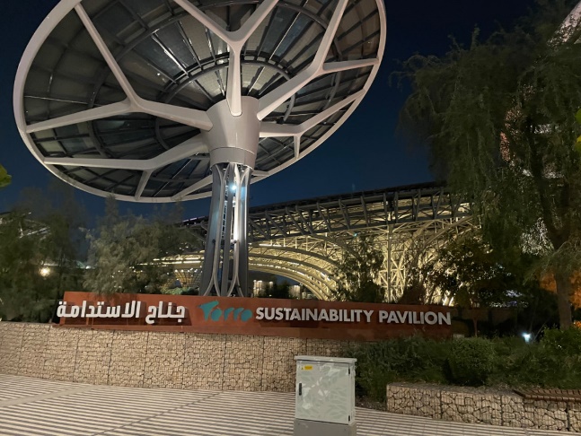 (The entrance sign of the Sustainability Pavilion, behind which stood the “solar power umbrella” of the pavilion, named Terra)