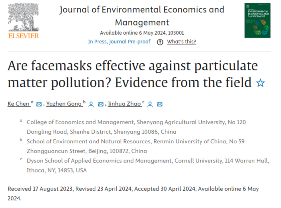 On May 6, 2024, Professor Yazhen Gong from the School of Ecology & Environment at Renmin University of China, along with collaborators Professor Ke Chen from Shenyang Agricultural University and Professor Jinhua Zhao from Cornell University, published their research entitled "Are facemasks effective against particulate matter pollution? Evidence from the field" in the Journal of Environmental Economics and Management (JEEM), a leading journal in resource and environmental economics. All three authors share co-first authorship, with Professors Gong and Zhao serving as corresponding authors. Notably, this represents Professor Gong's second publication in JEEM.