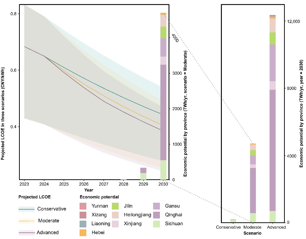 Abstract: We comprehensively evaluate concentrated solar power (CSP) potential in China across four dimensions: geographical, technical, economic, and CO2 mitigation, and extend the analysis from panel to time-series through learning curves and scenario analysis. Evidently, China has substantial CSP potential, with 1.65 million km2 geographical and