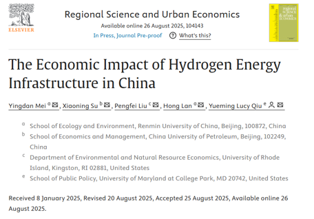 近日,2025最新赌博网站大全 梅应丹副教授作为第一作者,合作研究论文“The Economic Impact of Hydrogen Energy Infrastructure in China”发表在区域和城市经济研究领域的国际权威期刊Regional Science and Urban Economics上。论文通讯作者为马里兰大学公共政策学院邱月明教授。