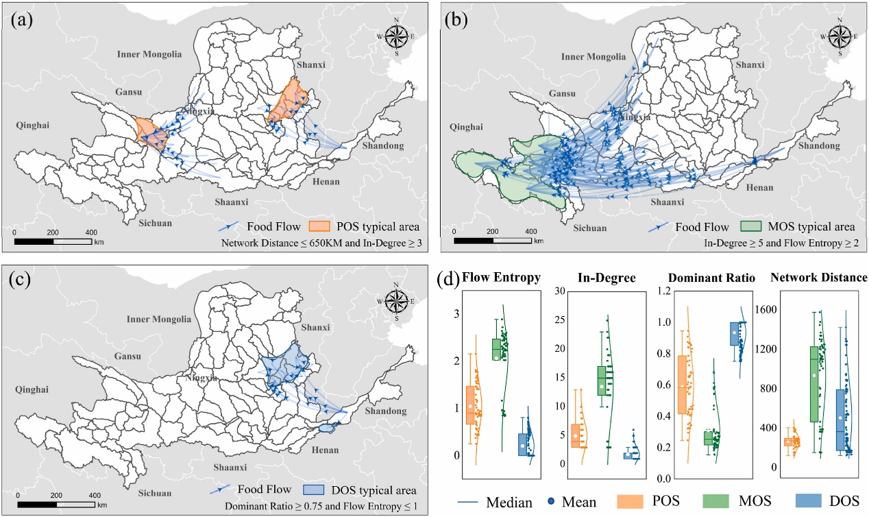 本研究采用增强的两步移动搜寻法和最小成本分配方法模拟了2000-2020年中国黄河流域区域间食物供给服务流动的路径与强度,并基于拓扑指标对生成的网络划分不同的流动结构,最后通过集成极限梯度提升树(XGBoost)与SHapley可加性解释(SHAP)方法解析其驱动机制。结果表明:研究期内供给-需求比从1.65显著增加至3.90;流动强度在2000年后有所减弱,但到2020年逐渐恢复。空间格局上,食物供给服务呈现出从中下游生产区向上游需求中心的定向流动特征。我们识别并刻画了三种典型结构:(1)邻近导向型流动,主要分布在生产能力有限、依赖邻近盈余区的区域,促进了短距离转移并增强了当地的韧性,主要受人口密度和交通可达性驱动;(2)多源导向型流动,主要分布在生态脆弱区,通过多样化的供给来源维持系统稳定性,反映了地形起伏度和气候的约束;(3)主导导向型流动,主要分布在高生产能力和高可达性区域,以高效但脆弱的中心化网络为特征,容易受景观集中度和地形的共同塑造。上述结构阐明了食物供给服务流动的基本空间组织原则。因此,本研究提出的生态系统服务流动空间结构网络框架为制定流域内外的针对性粮食安全策略提供了系统性支撑工具。